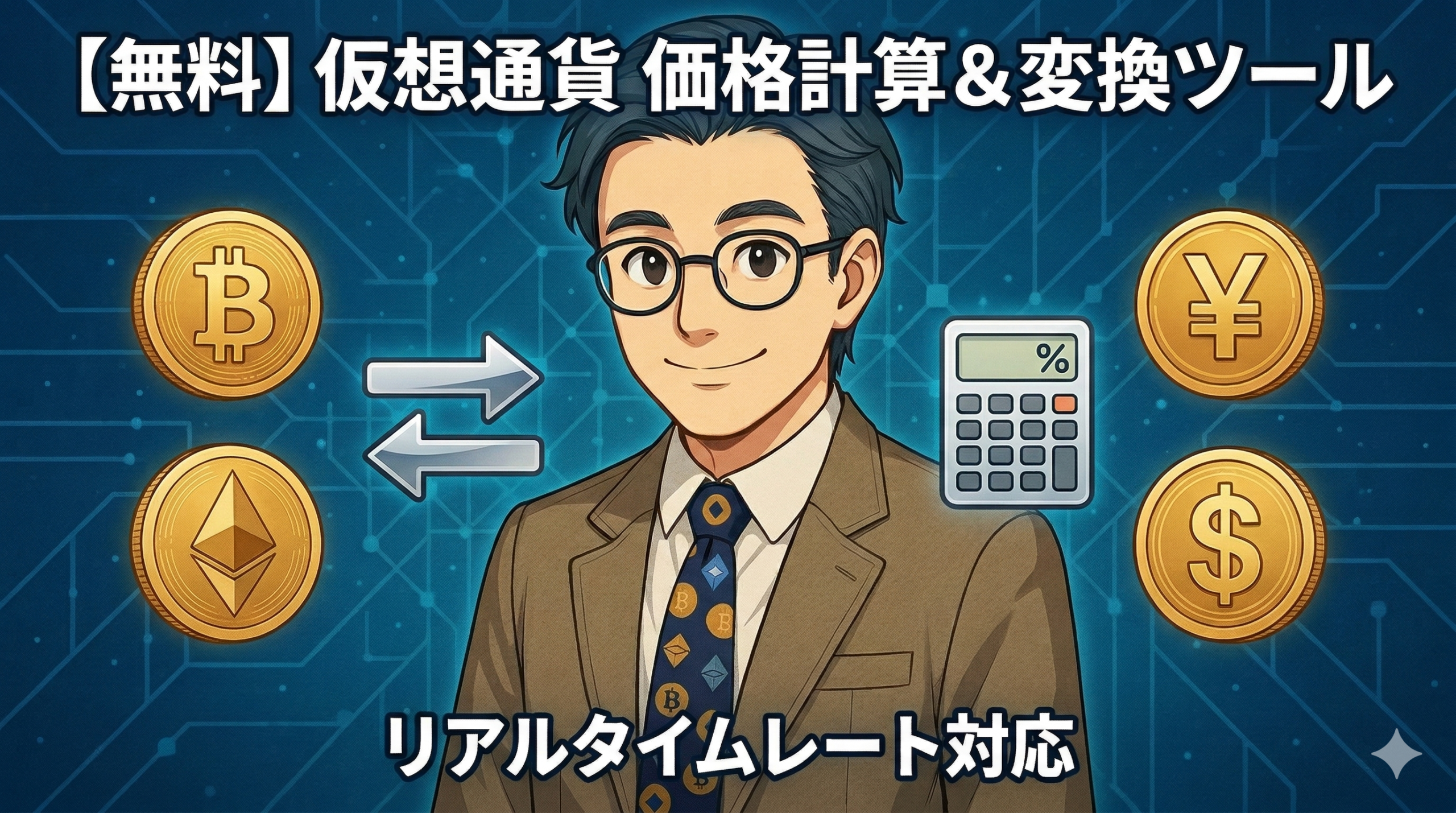 そこで今回は、当サイト上でサクッと計算できる**「仮想通貨⇔法定通貨(日本円・米ドル)」のリアルタイム価格変換ツール**をご用意しました。完全無料で、登録なども一切不要で何度でもご利用いただけます。